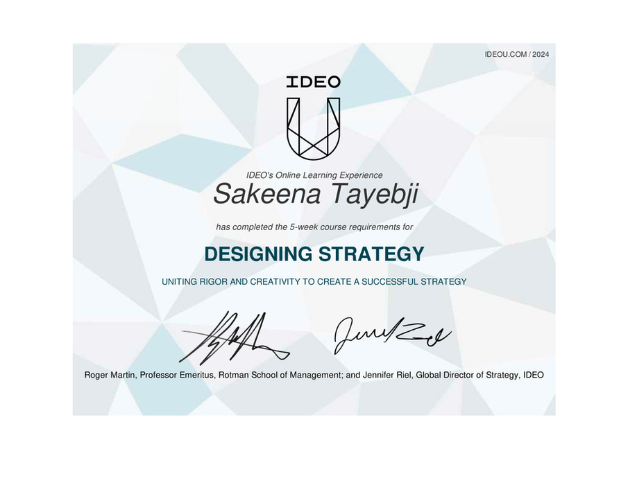I see design as a practice of continual evolution- one that demands curiosity, reflection, and a commitment to learning. Certifications, for me, are not badges but extensions of my craft- ways to deepen expertise, explore emerging tools, and challenge established ways of thinking. Staying current and adaptable is central to how I grow as a designer and how I approach complex, shifting problem spaces.